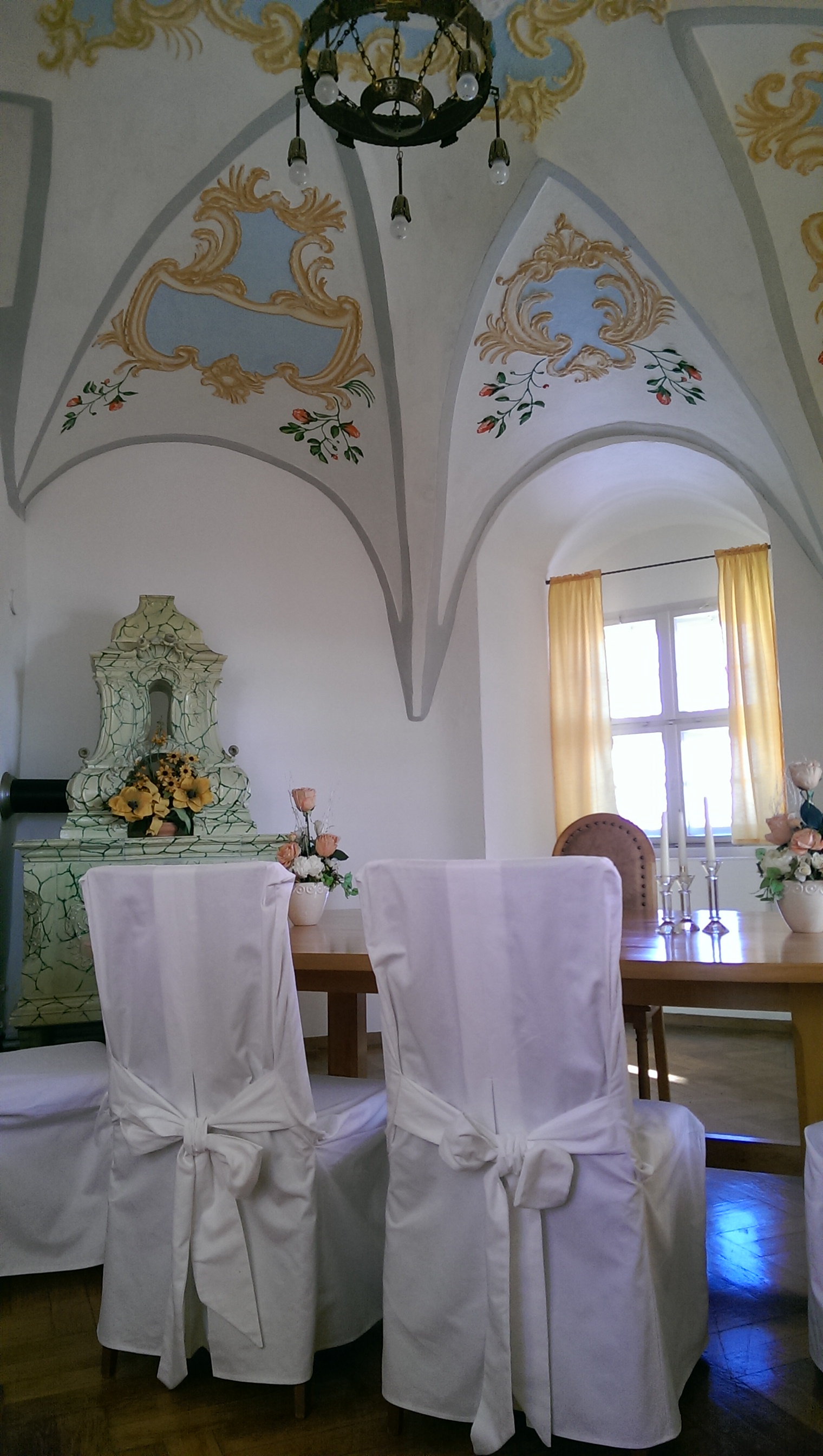 Nachdem der Bräutigam die Braut im Innenhof des Schlosses in Empfang genommen hat, begibt sich das Brautpaar mit der Hochzeitsgesellschaft in den Trausaal des Schlosses.